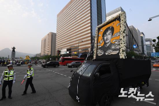 9일 오후 서울광장에서 열린 ‘이한열 열사 30주기 문화제’ 참석자들이 이한열 열사 장례행진을 재현하고 있다.