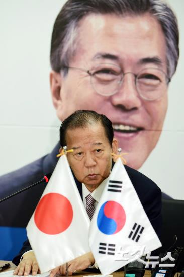 아베 신조 일본총리 특사로 방한한 니카이 도시히로 일본 자민당 간사장이 12일 오전 서울 여의도 더불어민주당 당사를 방문해 추미애 대표를 만난 가운데 회의실 뒤로 문재인 대통령의 사진이 보이고 있다.
