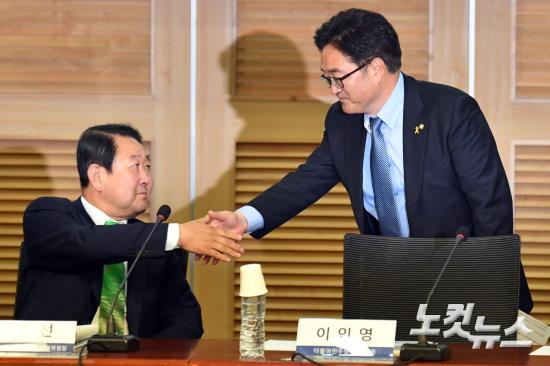 19일 오후 국회 의원회관에서 열린 '사드와 한미FTA 재협상 : 주요 쟁점과 과제 토론회'에 참석한 국민의당 박주선 비상대책위원장과 더불어민주당 우원식 원내대표가 인사를 하고 있다.