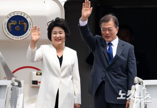 문재인 대통령과 부인 김정숙 여사가 28일 오후 경기도 성남 서울공항에서 취임 후 첫 해외 순방 일정인 한미 정상회담을 위해 미국으로 출국하고 있다.
