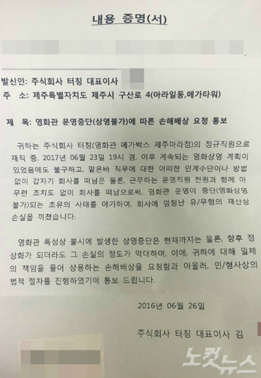 메가박스 제주아라점 대표이사 김모씨가 자신의 아들 갑질 문제로 전원 퇴사한 직원들에게 보낸 내용증명서. (사진=문준영 기자)