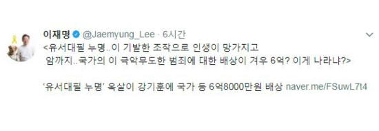 이재명 성남시장은 트위터에 관련 기사를 링크하면서 "유서대필 누명, 이 기발한 조작으로 인생이 망가지고 암까지…국가의 이 극악무도한 범죄에 대한 배상이 겨우 6억? 이게 나라냐?"고 일침을 날렸다.