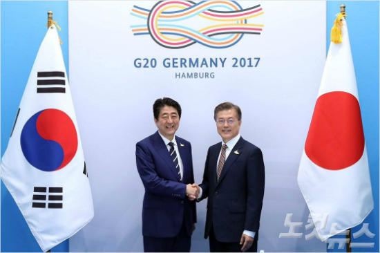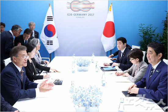 문 대통령과 이날 주요정상 20개국(G20) 정상회의가 열리는 독일 함부크르 메세 A홀 내 양자회담장에서 아베 총리를 만나 "한·일 관계를 더 가깝지 못하게 가로막는 무엇(위안부 합의)이 있다며 우리 국민 대다수가 정서적으로 수용하지 못하고 있는 현실을 인정하면서 양국이 공동으로 노력하여 지혜롭게 해결해 나갈 것과, 이 문제가 한·일 양국의 다른 관계 발전에 걸림돌이 되어서는 안 된다"고 말했다고 박수현 청와대 대변인이 전했다.