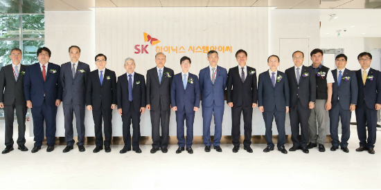 SK하이닉스 시스템아이씨 출범식에서 김준호 사장(우측에서 일곱번째)과 SK하이닉스 박성욱 부회장(좌측에서 일곱번째) 등이 기념촬영을 하고 있다. (사진=SK하이닉스 제공)