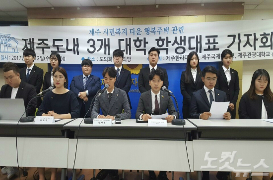 제주 한라대학교와 관광대학교, 국제대학교 총학생회는 12일 오후 제주도의회 도민의방에서 기자회견을 열고 "행복주택은 희망의 상징"이라며 "3개 대학은 시민복지타운 행복주택 설립을 지지한다"고 밝혔다.