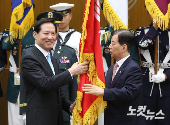 송영무 신임 국방부 장관(왼쪽)이 14일 오전 서울 용산구 국방부에서 열린 장관 이·취임식에서 한민구 전 장관으로부터 국방부기를 이양 받고 있다.