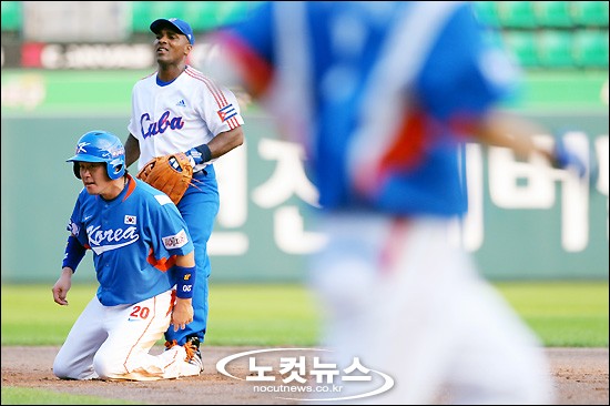 [BestNocut_R]베이징올림픽에 출전하는 야구대표팀이 6일 오후 서울 잠실야구장에서 ''강호'' 쿠바와 평가전을 가졌다. 2회초 무사 1루 상황에서 박진만의 희생번트 때 1루 주자 진갑용이 2루에서 아웃되고 있다.