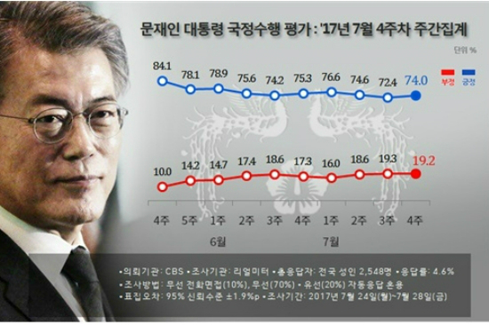 여론조사업체 리얼미터가 CBS라디오 <김현정의 뉴스쇼> 의뢰로 지난 24일부터 28일까지 전국 19세 이상 유권자 2548명을 상대로 조사한 결과 문 대통령의 국정수행 지지율은 지난주보다 1.6%포인트 오른 74.0%를 기록했다.