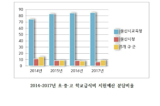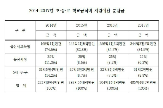 울산시교육청의 초·중·고 급식비 지원예산은 2014년 165억1천만 원, 올해 344억2천5백만 원으로, 지원비율도 74.5%에서 84.9%로 매년 오르고 있다.