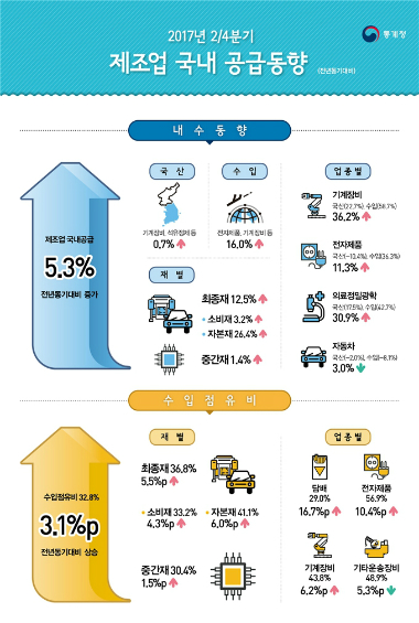 8일 통계청이 발표한 '2/4분기 제조업 국내공급동향'을 보면 올해 2/4분기 제조업 국내공급은 국산, 수입이 모두 늘어 전년동기대비 5.3% 증가했다.