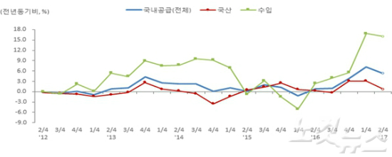 지난해 1/4분기만 해도 -5.1%였던 수입 증감률은 2/4분기 2.4%, 3/4분기 4.0%, 4/4분기 5.6%, 올해 1/4분기 16.9%에 이어 5분기 연속 증가세를 이어갔다.