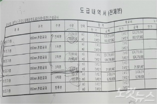 취재진이 이에 문제를 제기하자 제주도는 이날 오후 변경된 도급내역서를 다시 보내왔다. 골재 수급 내역조차 제대로 파악하지 못하고 있던 것이다.