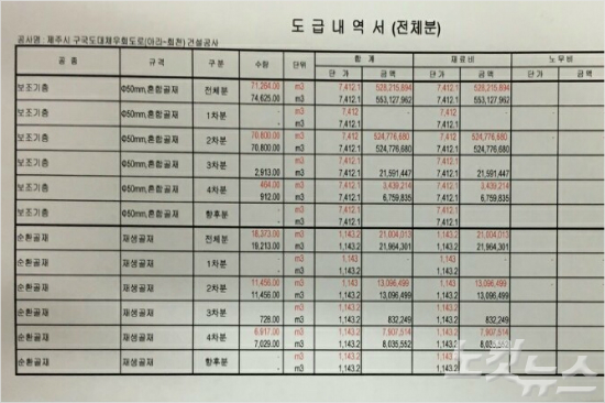 제주도가 처음 공개한 제주시 구국도 대체우회도로(아라-회천) 건설공사 보조기층 골재 도급내역서. 보조기층에 사용되는 골재(50mm이하)를 모두 구입하는 것으로 돼있다. (사진=문준영 기자)