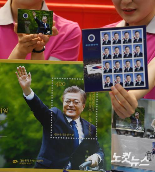 9일 오전 서울 중구 중앙우체국에서 우정사업본부 직원들이 '제19대 대통령 취임 기념우표‘ 를 선보이고 있다. 문 대통령 취임 100일이 되는 오는 17일 발행되는 기념우표는 기념우표 500만장, 소형시트 50만장, 기념우표첩 2만부가 발행된다.