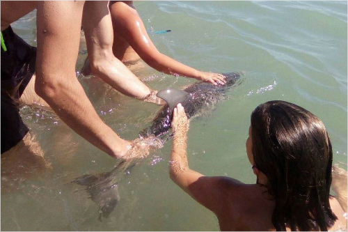 관광객들이 이러저리 만지는 통에 아기 돌고래는 극심한 스트레스를 받고 숨을 거뒀다. 사인은 스트레스로 인한 심부전과 폐질환.