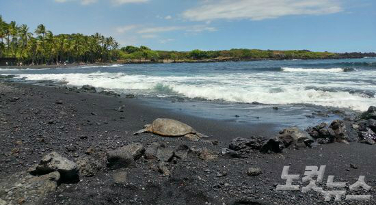 화산활동으로 만들어진 검은 모래사장위로 거북이 한마리가 거닐고 있다(사진=웹투어 제공)