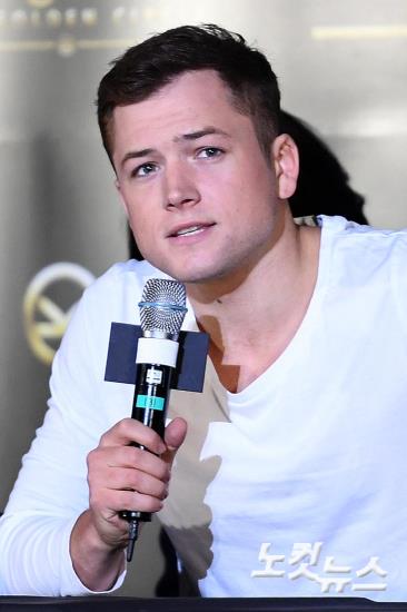 배우 태런 에저튼이 21일 오후 서울 CGV용산아이파크몰에서 열린 영화 '킹스맨-골든서클' 내한기자회견에서 인사말을 하고 있다.