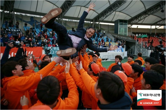 지난해 승강 플레이오프에서 성남FC를 잡고 K리그 클래식으로 승격한 강원FC. (사진=한국프로축구연맹 제공)
