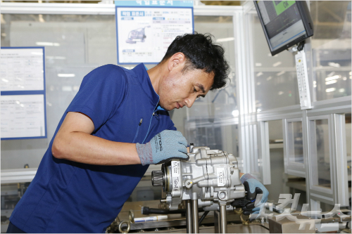 27일 경남 창원시 성산구 현대위아 창원3공장에서 한 직원이 전자식 차동 제한장치(e-LSD)를 검수하고 있다.(사진=현대위아 제공)