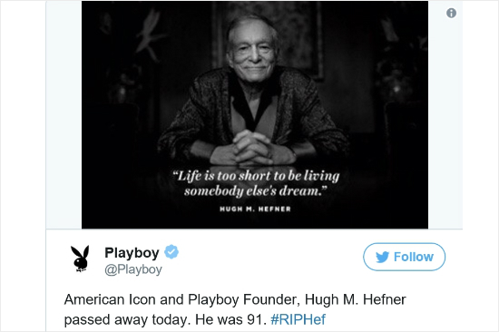 플레이보이 엔터프라이즈는 이날 성명을 내고 "헤프너가 미국 로스앤젤레스 자택에서 평화롭게 숨을 거뒀다. 사인은 노환으로 인한 자연사"라고 밝혔다.