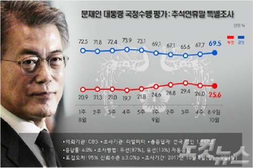 여론조사 전문기관 리얼미터는 CBS 의뢰로 지난 8일부터 9일 이틀간 전국 유권자 1,047명을 상대로 여론조사를 벌인 결과(95% 신뢰수준, 표본오차 ±3.0%p), 문 대통령의 국정수행 지지율은 연휴 직전보다 1.8%p 오른 69.5%로 조사됐다고 10일 밝혔다.