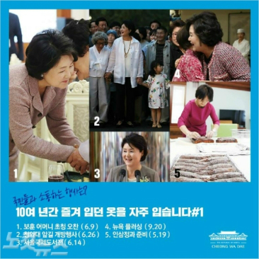 청와대는 9일 페이스북에 "김정숙 여사의 패션이 궁금하시다고요?"라는 제목으로 카드뉴스 형태의 이미지를 게시했다. 새 정부 출범 이후 김 여사가 공식·비공식 행사장에서 착용했던 옷들의 사진이 담겼다. 자세한 설명도 함께 덧붙였다.