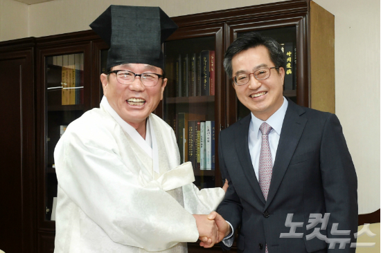김동연 부총리 겸 기획재정부장관이 10일 김영근 성균관장과 만나 악수하고 있다. (사진=기획재정부 제공)