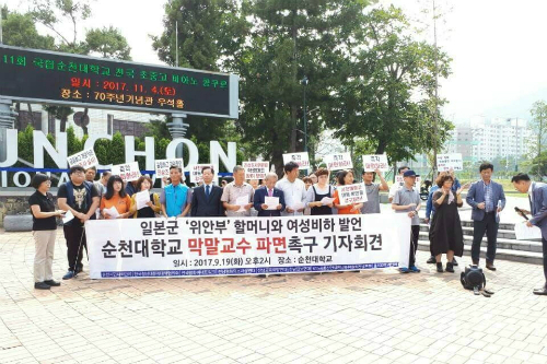 결국 박진성 순천대 총장은 지난달 19일 성명을 내고 A교수의 위안부 관련 부적절한 언행과 인격 모독적 발언에 대해 사과하고 엄중조사와 재발방지를 약속했다.