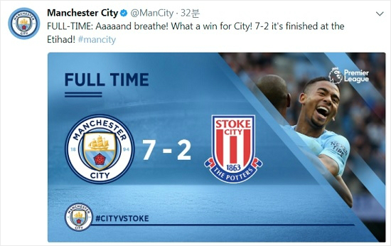 2017~2018 잉글랜드 프리미어리그의 강력한 우승 후보 맨체스터시티는 스토크시티와 8라운드에서 7-2 대승을 거두며 당당히 선두 자격을 입증했다.(사진=맨체스터시티 공식 트위터 갈무리)