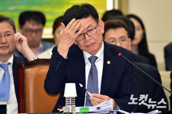 김상조 공정거래위원장이 19일 오전 국회 정무위원회 공정거래위원회, 한국소비자원, 한국공정거래조정원 등에 대한 국정감사에서 머리를 만지고 있다.
