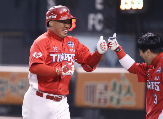 '꽃범호의 환한 미소' KIA 타이거즈 이범호가 30일 잠실구장에서 열린 두산 베어스와 '2017 타이어뱅크 KBO리그' 한국시리즈 5차전에서 3회초 만루 홈런을 터트린 뒤 팀 동료 김선빈의 환영을 받고 있다. (사진=KIA 제공)