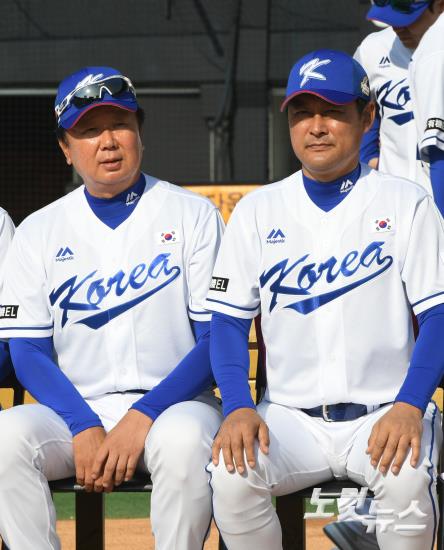 5일 오후 서울 잠실야구장에서 열린 아시아프로야구챔피언십 2017 대표팀 첫 공식 훈련에 앞서 선동열 감독과 이종범 코치가 기념촬영을 하고 있다.