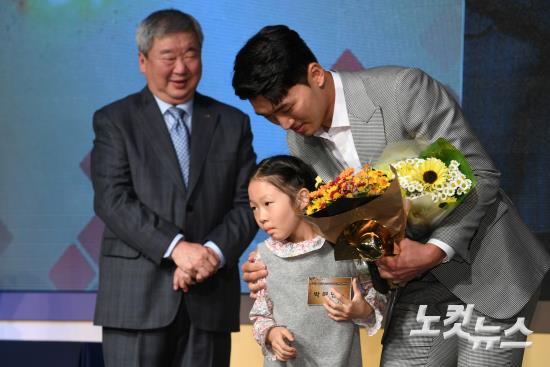 6일 오후 서울 인터컨티넨탈 서울코엑스에서 열린 2017 타이어뱅크 KBO 시상식에서 삼성 박해민이 도루상을 수상 후 동생에게 꽃다발을 받고 있다.