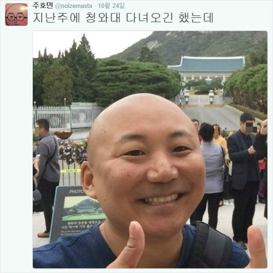 해당 사진 속 주호민은 양손 엄지 손가락을 치켜세운 채 환하게 웃고 있다. 그런 그의 뒤로는 멀찍이 자리잡은 청와대가 앵글 안에 들어왔다. 이 사진에 덧붙여 주호민은 다음과 같은 글을 남겼다.
