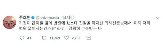 주호민은 6일 자신의 SNS에 올린 글에서 "기침이 끊이질 않아 병원에 갔는데"라고 운을 뗐다.