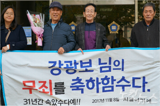 수사기관의 혹독한 고문과 조작에 간첩으로 내몰렸던 강광보(76) 할아버지가 1심과 마찬가지로 재심 항소심에서도 무죄를 선고받았다.