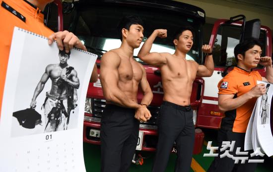 서울소방재난본부 몸짱 소방관들이 10일 오후 서울 반포동 서초소방서에서 ‘2018년 몸짱 소방관 희망나눔달력’ 을 홍보하기 위해 포즈를 취하고 있다. 달력의 판매 수익금 전액은 의료취약계층 화상환자 치료에 쓰일 예정이다.
