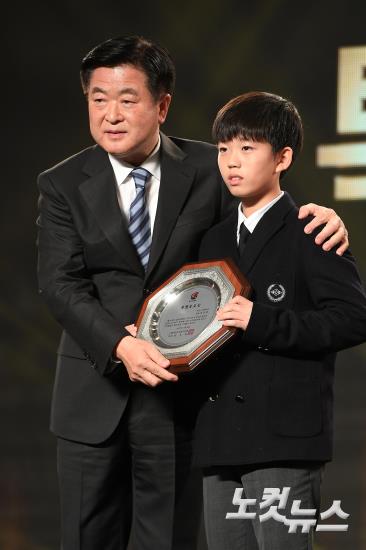 20일 서울 그랜드힐튼호텔에서 열린 KEB하나은행 K리그 어워드 2017에서 故 조진호 부산 아이파크 감독의 아들 한민 군이 특별 공로상을 대리 수상을 하고 있다.