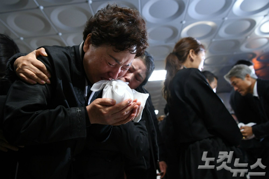 세월호 미수습자 양승진 교사, 남현철 군, 박영인 군의 발인이 엄수된 20일 오전 경기도 안산시 단원고등학교에서 양승진 교사의 유가족이 유픔을 건네 받고 오열하고 있다. (사진=이한형 기자)