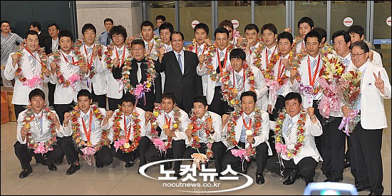 베이징 올림픽에서 9전 전승으로 금메달을 목에 건 야구대표팀 선수들이 25일 오후 인천공항을 통하여 입국, 입국장에서 파이팅을 외치고 있다.
