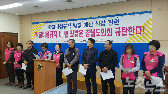 경남 학교비정규직 노동자들이 급식 종사자들의 체불된 급식비 예산을 세 번이나 삭감한 도의회를 규탄하고 나섰다.