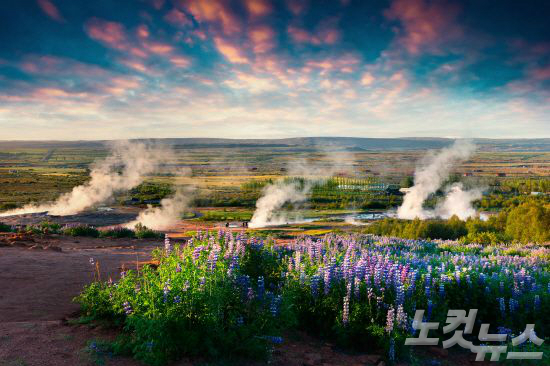 1294년 화산 분화로 인해 생긴 간헐천 게이시르. 한동안 활동이 정지됐지만 2000년 아이슬란드에 발생한 지진 이후 활동이 재개돼 지금도 곳곳에서 수증기가 피어오른다. 20~30m 정도 높이의 물기둥이 5분에서 10분 간격으로 분출하며 물의 온도는 80~90도로 뜨겁다. 분수처럼 하늘 높이 솟구쳐 오르는 모습을 보고 있으면 마치 지구가 살아 숨 쉬는 듯한 느낌을 받는다.