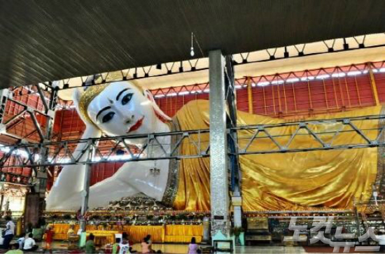 ◇ 차욱타지 불상차욱타지 불상은 양곤 최대이자 미얀마에서는 두 번째로 큰 와불로, 그 아름다움은 단연 최고로 꼽힌다. 길이 67m, 높이 8m 규모의 불상이 마치 휴식을 취하듯 오른손으로 머리를 받치고 누워 있다. 언덕 위에 누워 중생을 아울러 보는 듯 자비롭고 온화한 미소를 띤 와불의 모습이 무척이나 섬세하고 부드럽다.