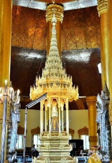 ◇ 쉐도우 파고다부처님의 진신 송곳니 사리는 미얀마 양곤과 만달레이 그리고 중국에 각각 1점씩, 총 4점이 전해지고 있다. 그중 하나를 보유하고 있는 쉐도우 파고다는 1997년 딴쉐장군의 명으로 전수상 킨뉸장군이 건립한 파고다로 건물의 내·외부를 모두 금으로 장식해 그 모습이 매우 화려하다. 또 중앙에 모셔진 부처님의 치아 사리는 8명의 나한에 둘러싸여 귀중하게 보관되고 있다.