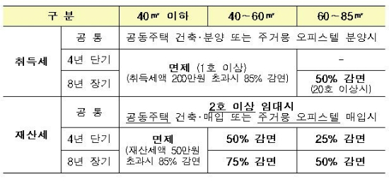 임대사업자로 등록한 민간임대주택에 대해선 취득세·재산세 감면이 2021년까지 3년간 연장되고, 8년 이상 장기임대시 최대 70%의 양도세 특별공제와 건강보험료 인상분의 80% 감면이 이뤄진다.