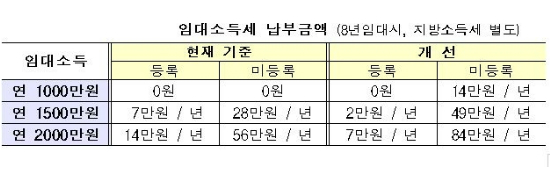 임대소득 외에 다른 종합소득금액이 2천만원 이하인 경우엔 등록사업자의 경우 임대소득 1333만원까지, 미등록시엔 800만원까지 소득세가 면제된다는 얘기다. 감면기준도 현행 3호 이상에서 내년부터 1호 이상으로 확대된다.