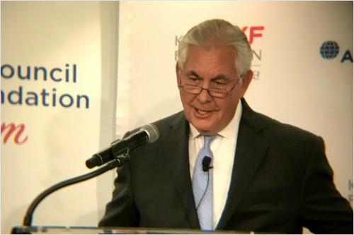 렉스 틸러슨 미 국무장관이 12일(현지시간) 아틀랜틱 카운슬에서 연설하고 있다. (사진=장규석 워싱턴 특파원)