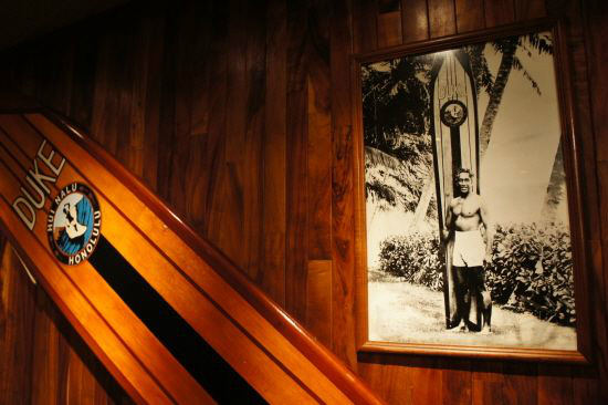 하와이 출신의 전설적인 서핑 선수 ‘듀크 카하나모쿠’의 사진과 관련 소품이 전시돼 있는 아웃리거 와이키키 호텔의 레스토랑 듀크스. 서퍼들의 성지이자 와이키키의 맛집으로 손꼽힌다. (사진=허니문리조트 제공)