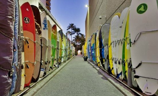 홀리데이 인 비치코머 호텔에서 와이키키 해변까지는 화려한 서핑보드로 장식된 길이 이어진다. 좁다란 골목 양옆으로 서핑보드가 나란히 서있어 그야말로 장관을 이룬다. 서핑 마니아는 물론 하와이 신혼여행객에도 이곳은 하와이 분위기가 물씬 느껴지는 사진을 촬영할 수 있는 포토존이기도 하다.