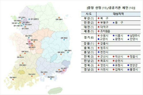 공공기관 제안 방식으로 선정된 곳은 △경기 시흥·남양주·고양·광명·얀앙시 △인천 동구 △충남 천안시 △경북 포항시·영양군 △경남 통영시 등 10곳이다.나머지 44곳은 광역지방자치단체들이 자체 선정한 지역이다.
